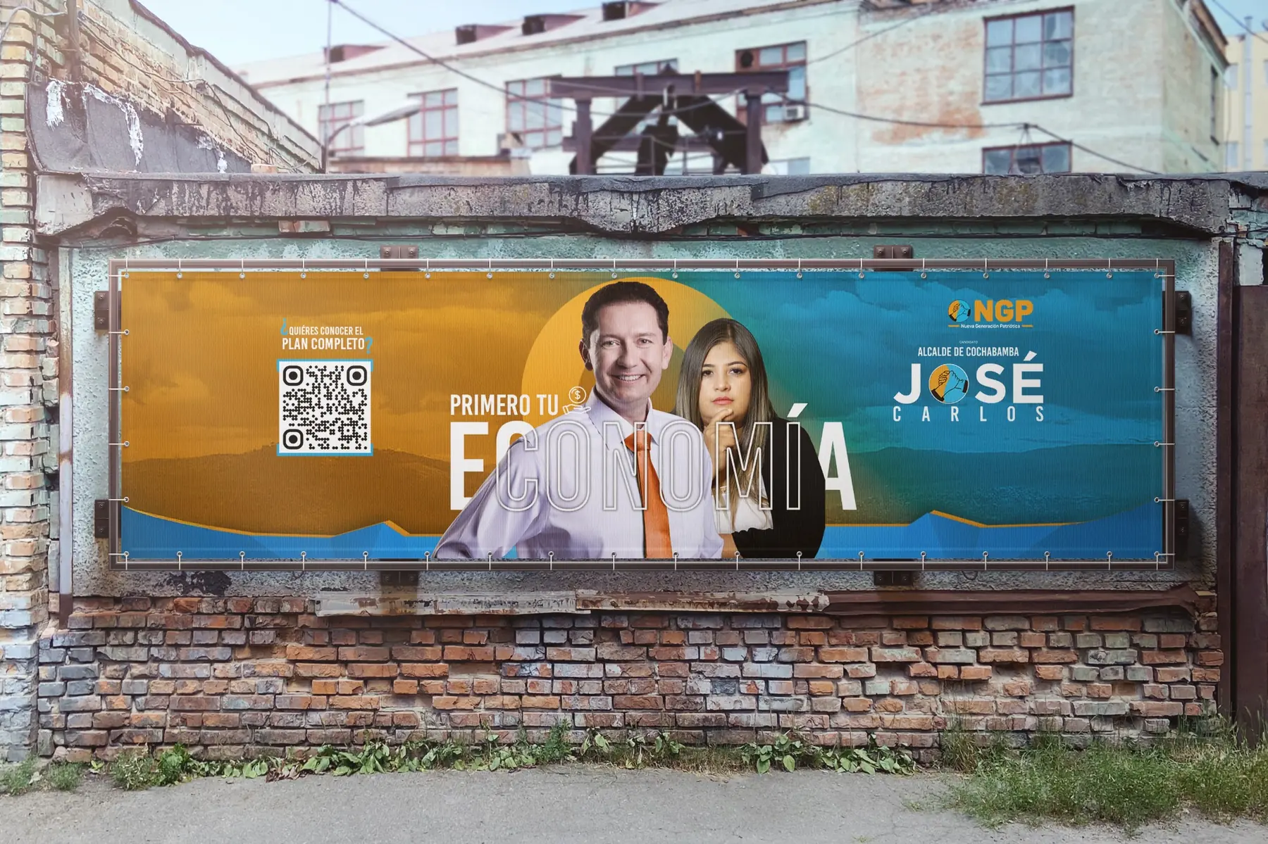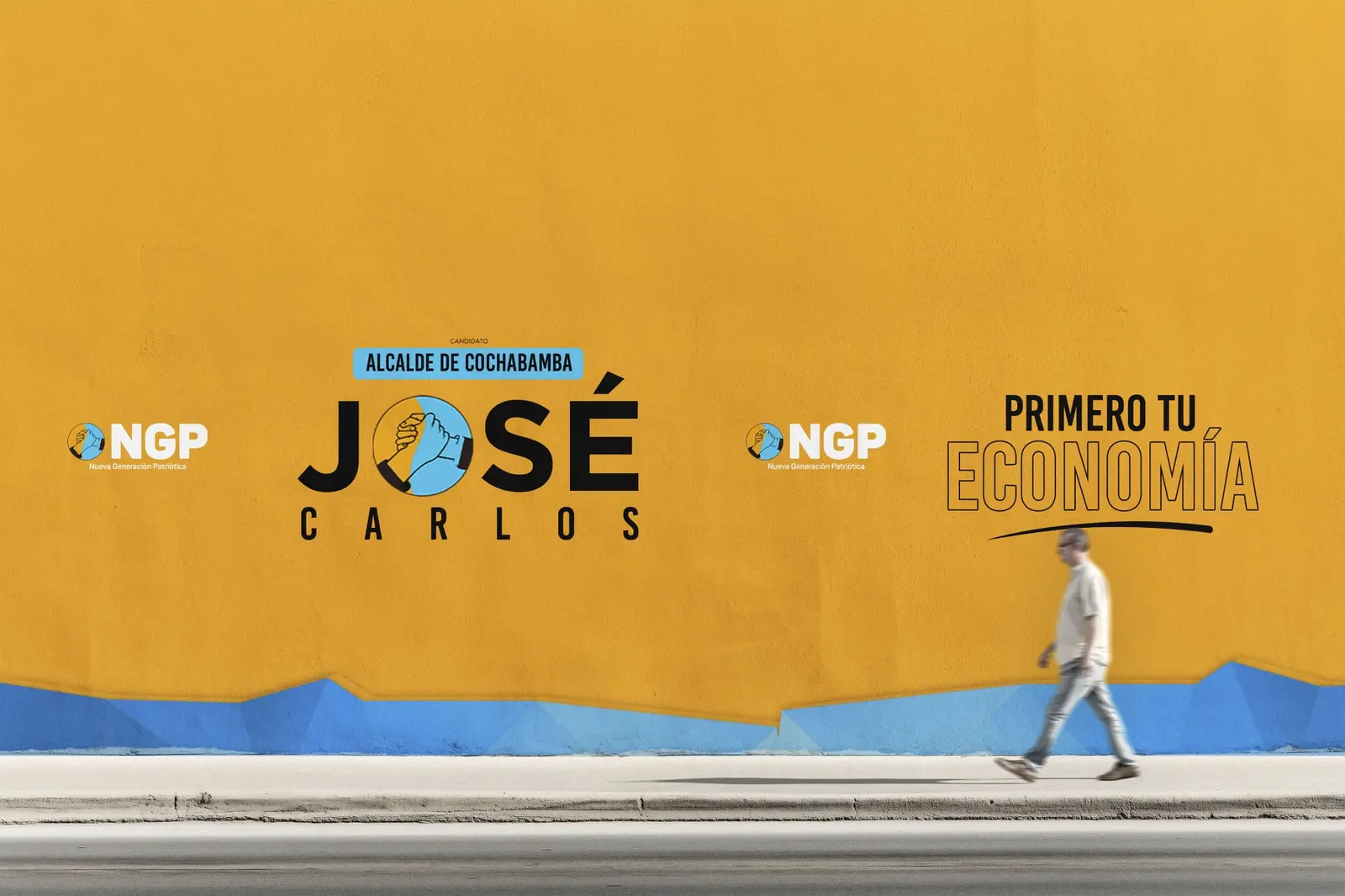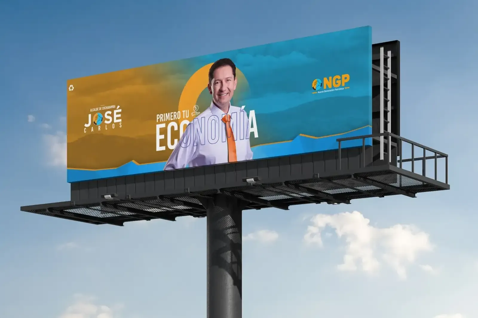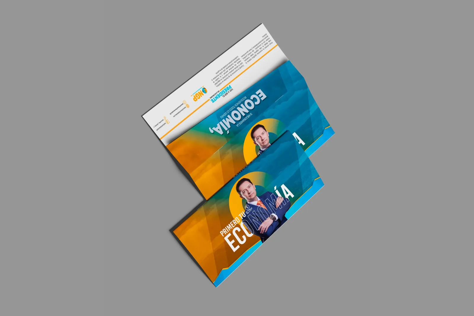 La propuesta visual se desarrolló a partir del eje “Primero tu economía”, posicionando el tema económico como mensaje central de la campaña. La composición utiliza los colores del partido NGP —azul y naranja— para reforzar la identidad política y generar un contraste visual de alto impacto.
