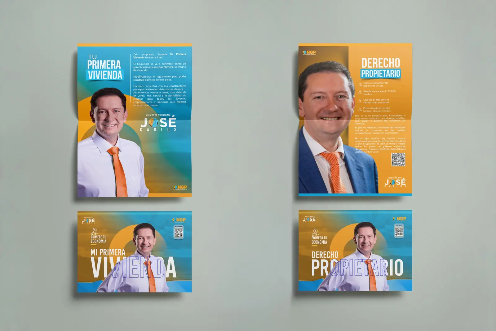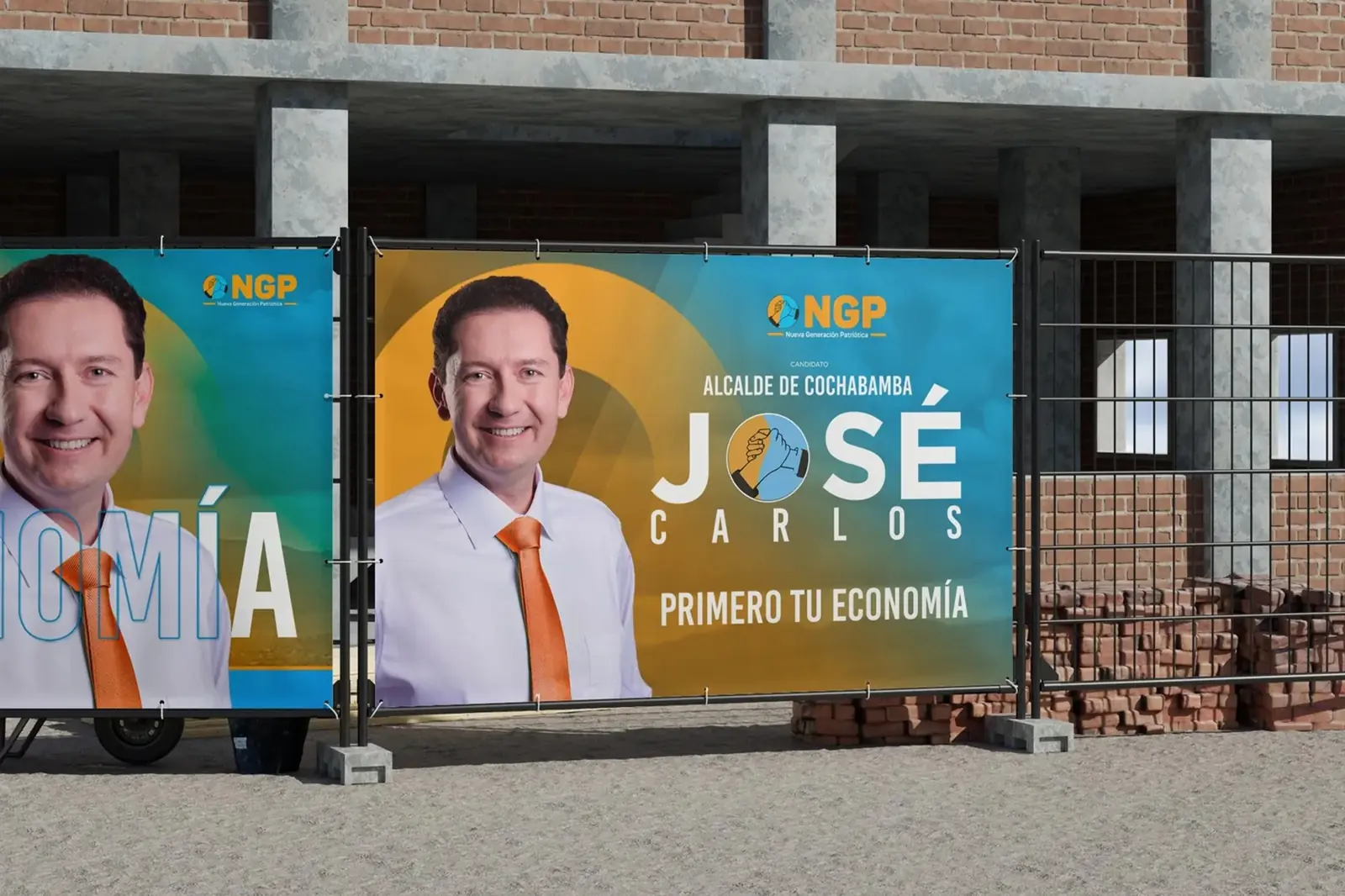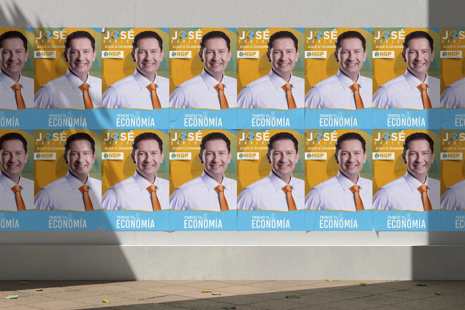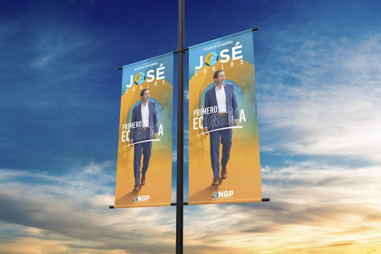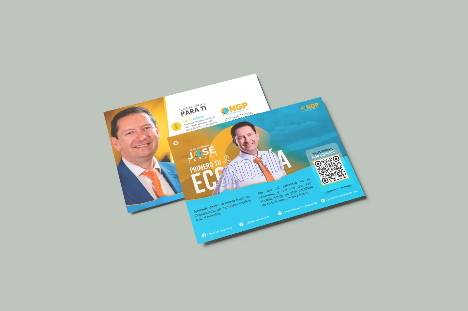 La propuesta visual se desarrolló a partir del eje “Primero tu economía”, posicionando el tema económico como mensaje central de la campaña. La composición utiliza los colores del partido NGP —azul y naranja— para reforzar la identidad política y generar un contraste visual de alto impacto.