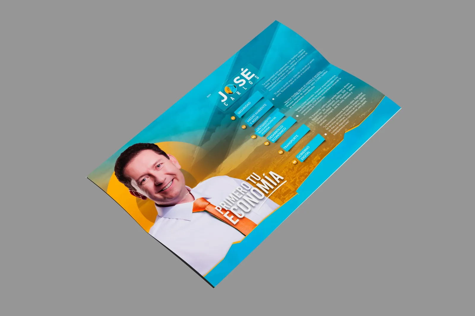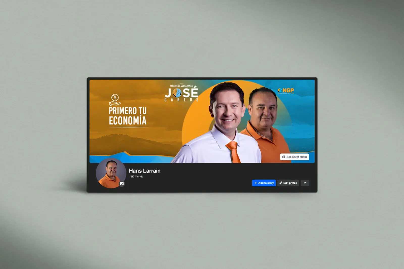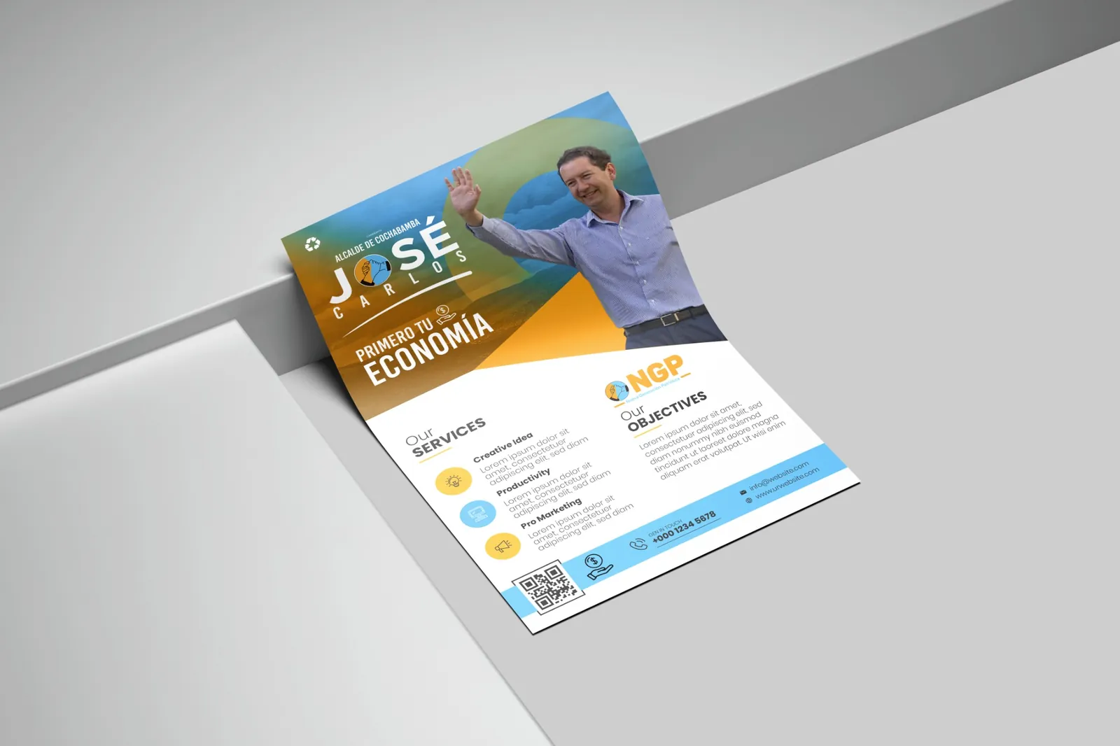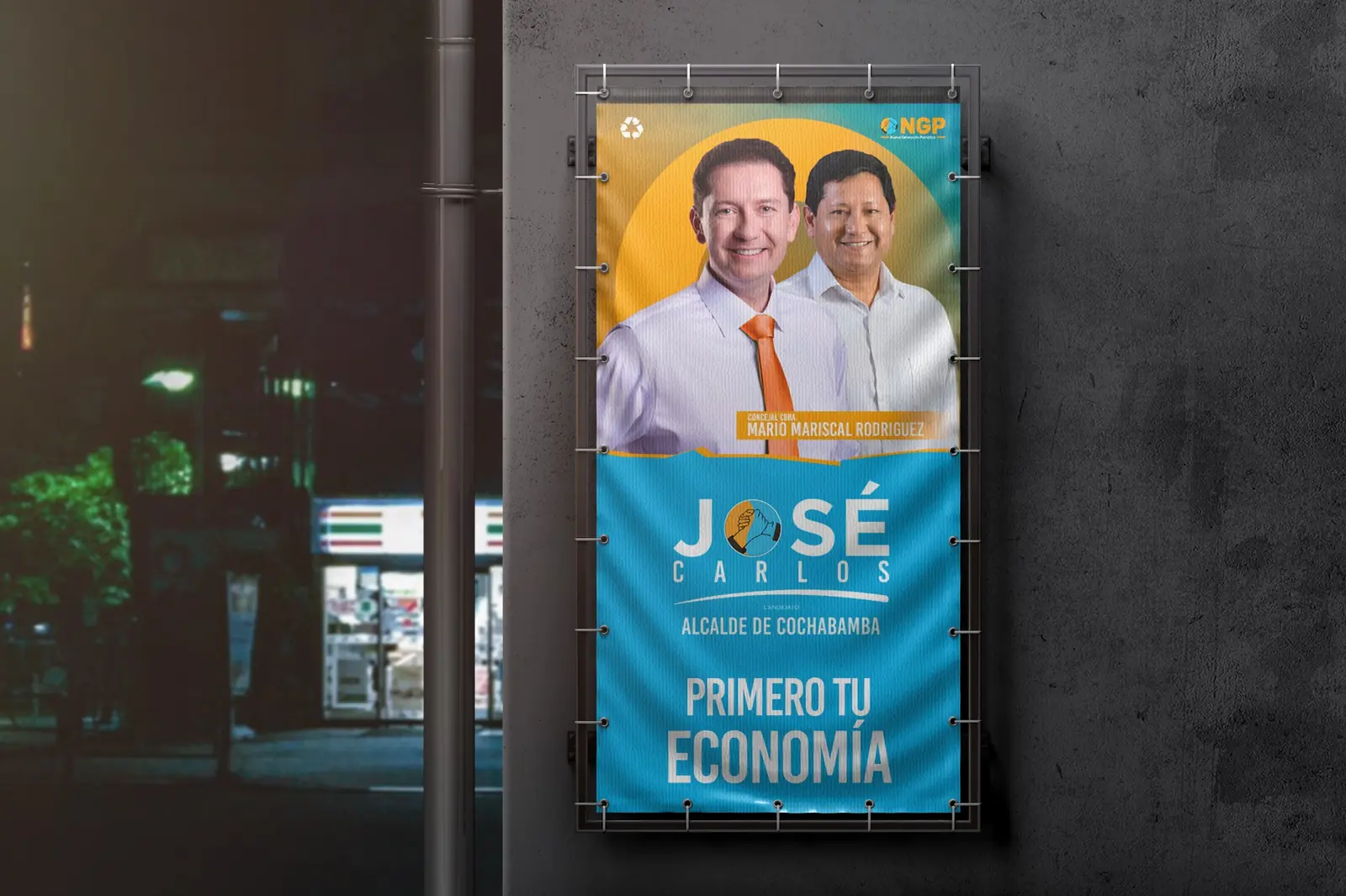 La propuesta visual se desarrolló a partir del eje “Primero tu economía”, posicionando el tema económico como mensaje central de la campaña. La composición utiliza los colores del partido NGP —azul y naranja— para reforzar la identidad política y generar un contraste visual de alto impacto.