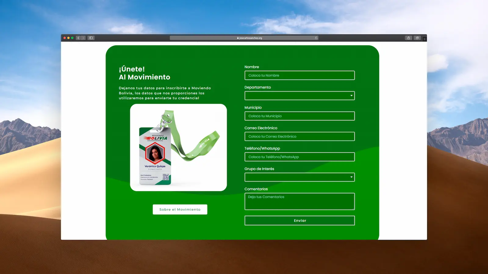 Desarrollamos una página web moderna y funcional que sirve como el centro digital de Moviendo Bolivia. Con un diseño intuitivo y enfocado en la experiencia del usuario, la web es una plataforma clave para difundir las propuestas, eventos y publicaciones de José Carlos, permitiendo una interacción directa con sus seguidores.